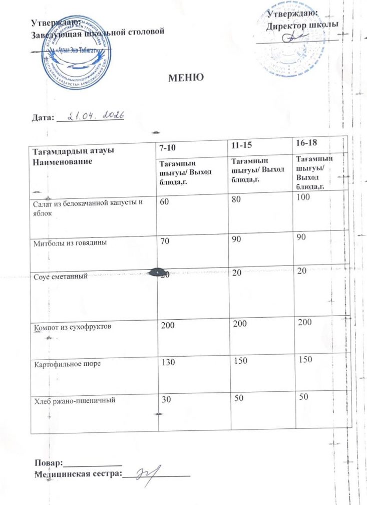 22.04.2026 жыл ас мәзірі